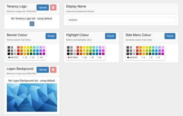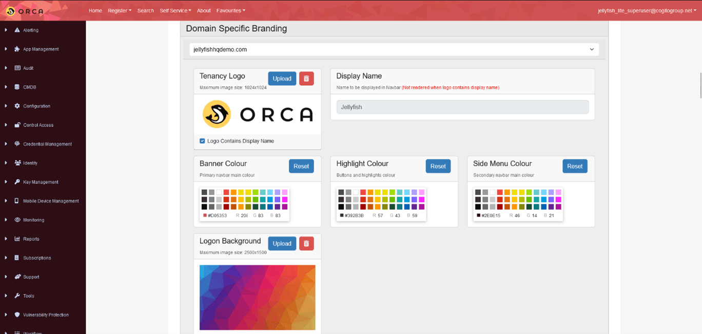 White labelling lets companies give Jellyfish a new look while reflecting their branding. Here, the Orca company has configured the logo and colours to match their red theming, along with a clean login background image. Changes made whilst on this page are previewed to you in real time, but will not be applied to other users until the “Submit” button is pressed.
